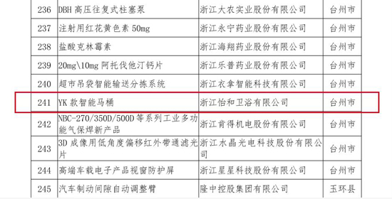 浙江省作為我國的智能馬桶產業(yè)集群帶,以龍頭形象影響著整個智能馬桶行業(yè)的發(fā)展,臺州更是智能馬桶之鄉(xiāng),怡和衛(wèi)浴產品作為唯一一款入選2019年度“浙江制造精品”的智能衛(wèi)浴產品,可見其產品創(chuàng)新技術的應用,企業(yè)產品生產管理能力在整個國內智能馬桶行業(yè)中實力不容小覷。