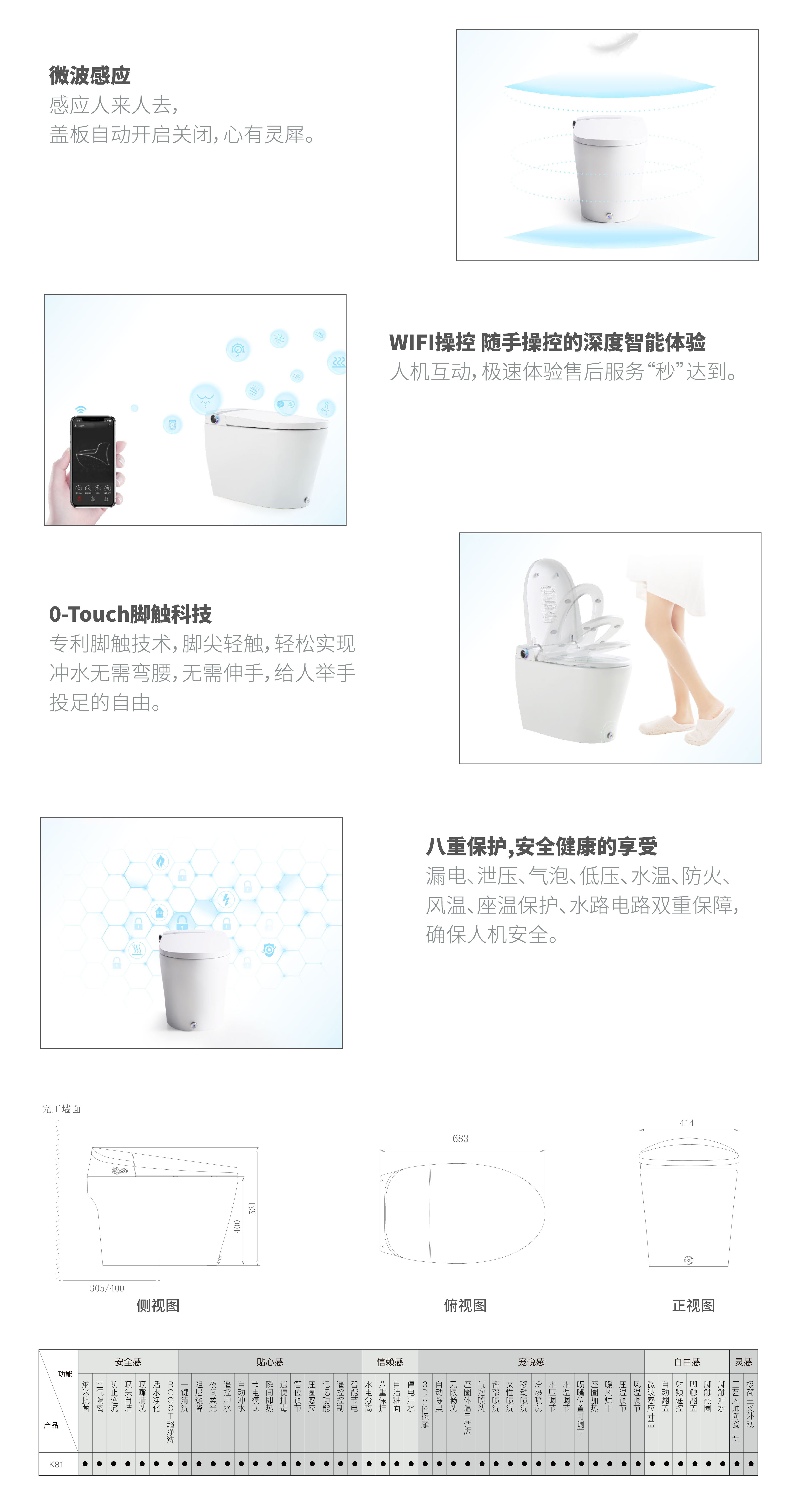 來自智慧的創(chuàng)舉,更來自對生活的敏銳洞察,在感應(yīng)式自動翻蓋的基礎(chǔ)上,更進一步,以獨具巧思的腳觸式翻圈、翻蓋、沖水技術(shù),徹底解放你的雙手,搭配專屬app控制,讓操作更加自如,服務(wù)更加快捷。
